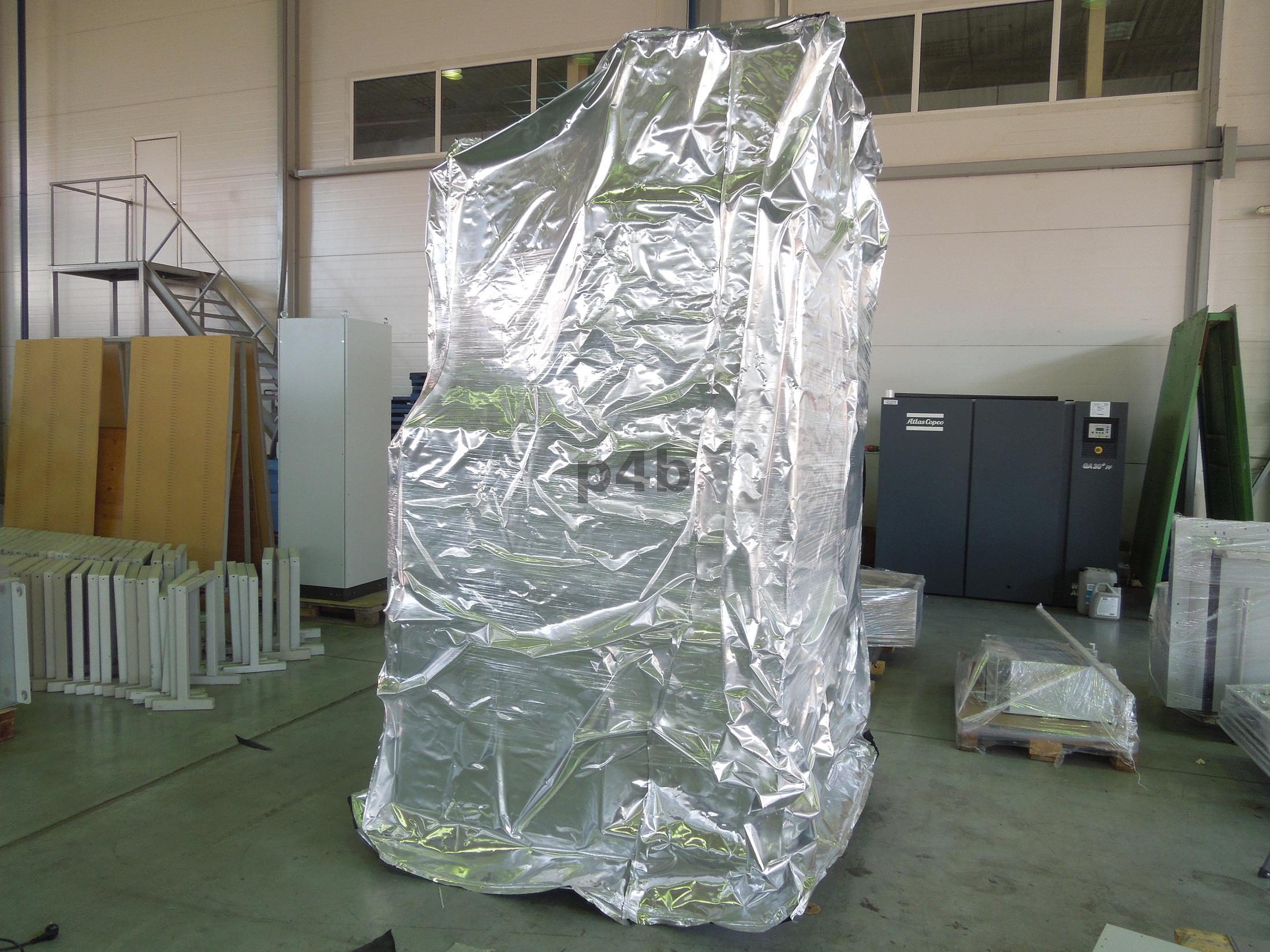 В основе: пленка среднего и низкого давления с алюминиевой прослойкой толщиной 7-9 микрон и лавсаном.Упаковка защищает оборудование, технику от любых воздействий внешней среды и перепадов температуры.